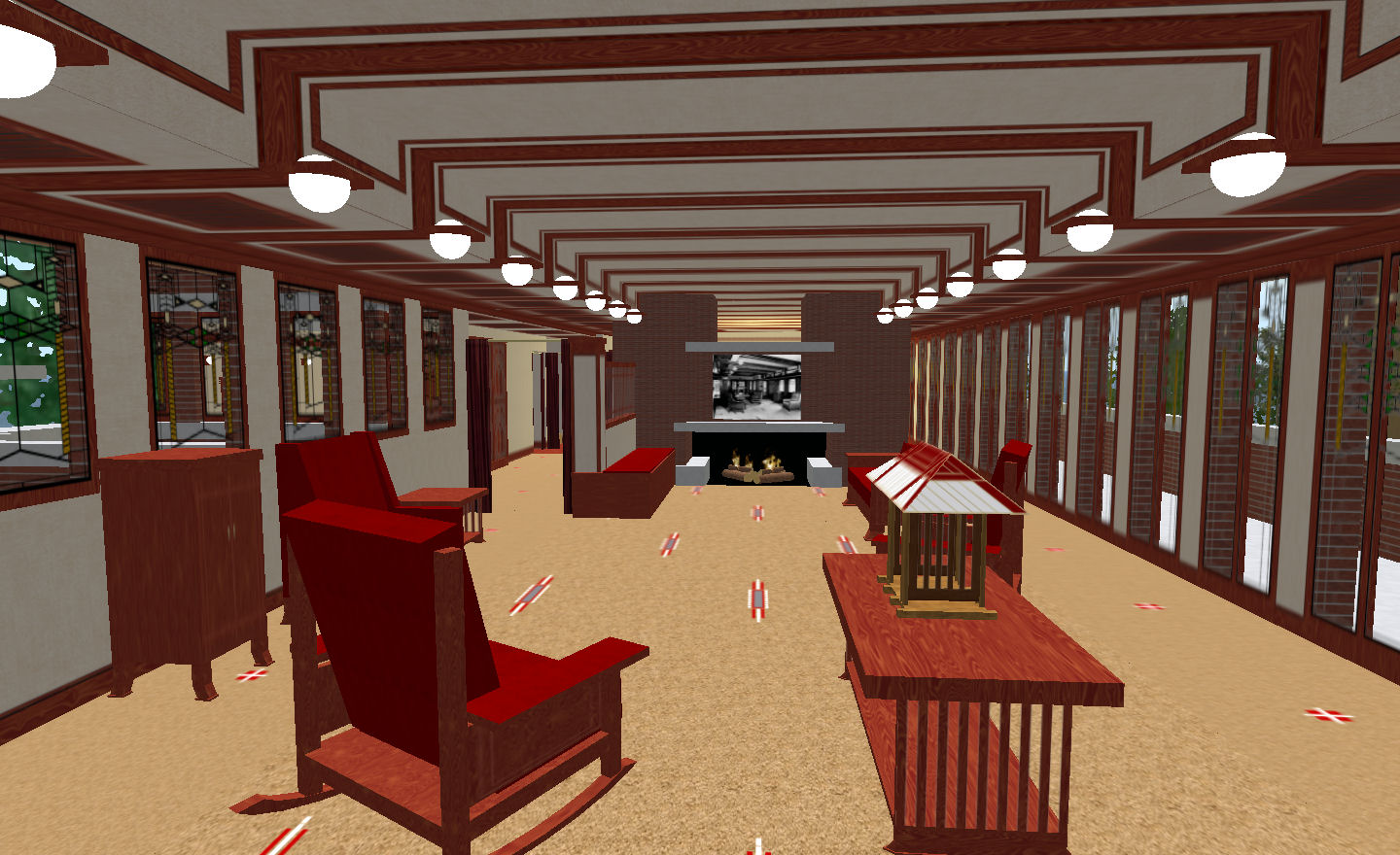 The reproduction at the FLW museum has been donated by Miltone Marquette, and is a beautiful model very faithful in looks and layout to the original. Just as FLW provided the interior furnishings for his Robie House, so has Miltone for this one. Each of the rooms has been finished in a decor matching that of the original and with furniture very similar to that of the original.