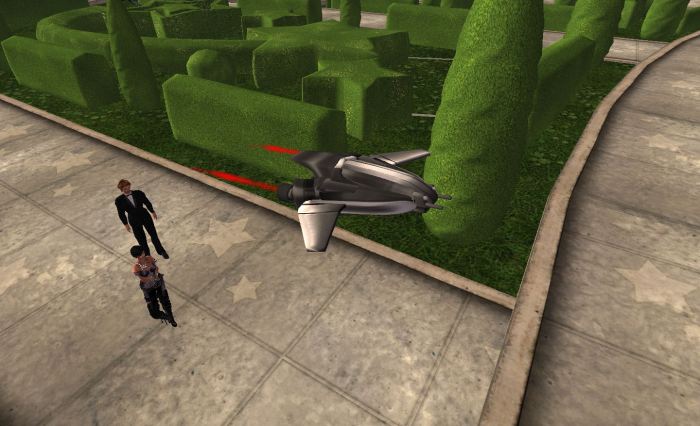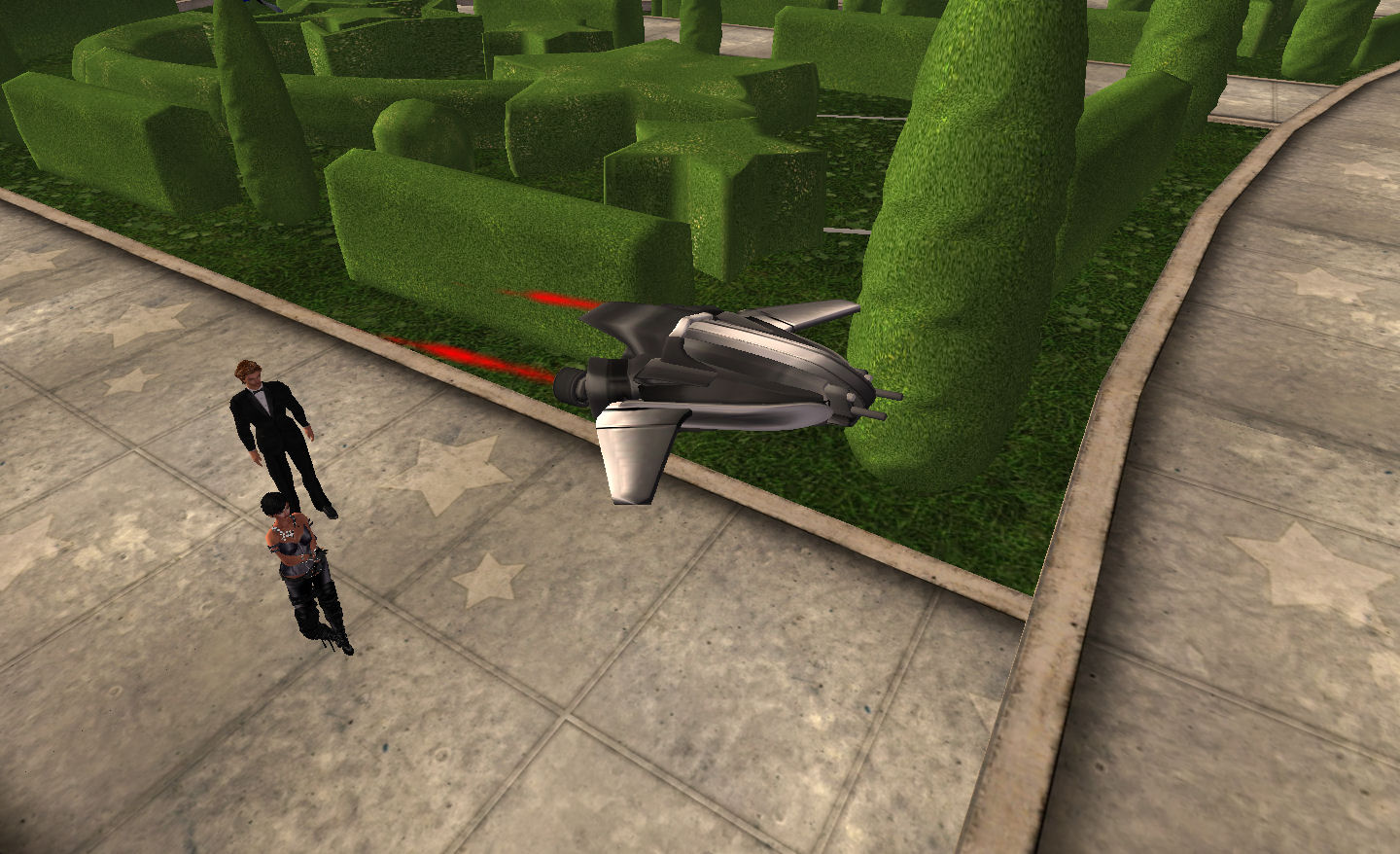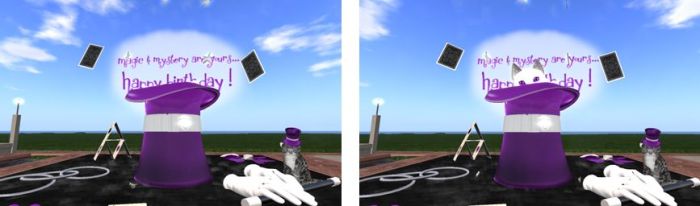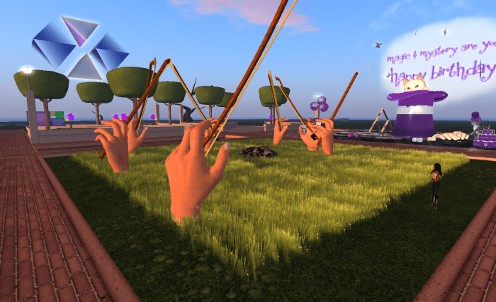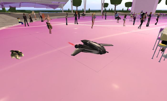 For the next half-hour, Rodvik mingled with those celebrating SL’s eighth birthday, chatting here and there, avoiding walls, boogie-ing around – or as he put it, “Dancing with my afterburner!” and describing his little ship as having, “Power seats and nanorobots ready to run amok and take over the galaxy. usual stuff :0”!