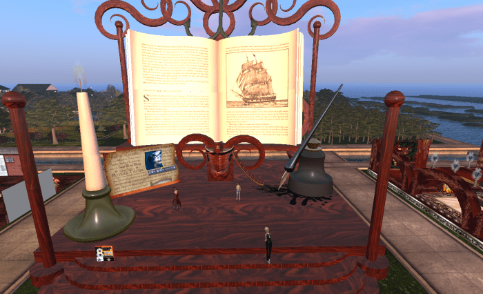 The Magic of Storytelling. An epic and magical book — Herman Melville’s “Moby Dick”— is used to celebrate live storytelling in SL. This book rests on a massive maritime stand, from which protrudes the podium from the story (made from the bow of a whaling ship). Readers can conduct a marathon “tag-team” style reading of Moby Dick to entertain book lovers at SL8B.