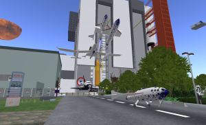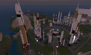 Across the water, in Spaceport Bravo (be a little careful around the sim boundary, the crossing can be rough) sit replicas of some of the more famous buildings from America’s Kennedy Space Centre – including the imposing bulk of the Vehicle Assembly Building. Here you can see the huge Saturn V rocket, used to launch men to the Moon, find out about other hardware, past and present…and complete another part of the Trivia Quiz. Atop the Vehicle Assembly Building is the observation deck; turn your draw distance up and enjoy the view (just be sure to notch it back down again to reduce the lag when you leave).