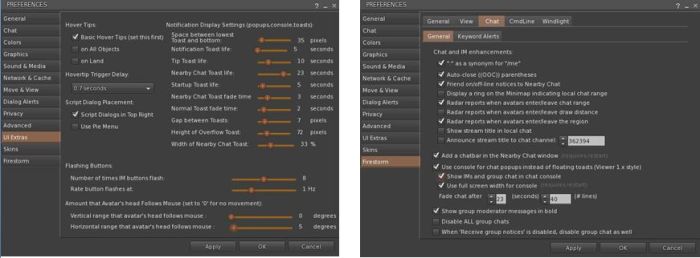 Other tabs within Preferences have also been massively improved. The Firestorm tab now includes pretty much everything those familiar with Phoenix would expect to see – with a lot of rationalisation and simplification of tabs and options. A nice touch here is that under FIRSTORM -> GENERAL you now get a greater choice in how names and display names are seen, and you can toggle between the Viewer 2 search and the “improved Viewer 2 beta” search (currently on the Search Project Viewer) – those who wish to compare and contrast and identify improvements can now have a field day playing with both! Within this sub-tab is one of my personal favourite new additions: TURN AVATAR AROUND WHEN WALKING BACKWARDS. This is something HUDdles has long had and I’ve really missed it when relying on built-in AOs.