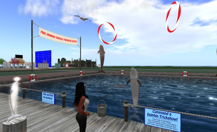 The Interactive Dolphin Trick show performs daily at 6:00am, 12:00pm and 6:00pm SLT, and you can see the dolphins and ride them yourself at all other times during SL8B; find it on SL8B Spectacular. If you want a dolphin or two for yourself, you can find them at Crissi’s shop at Mocis.