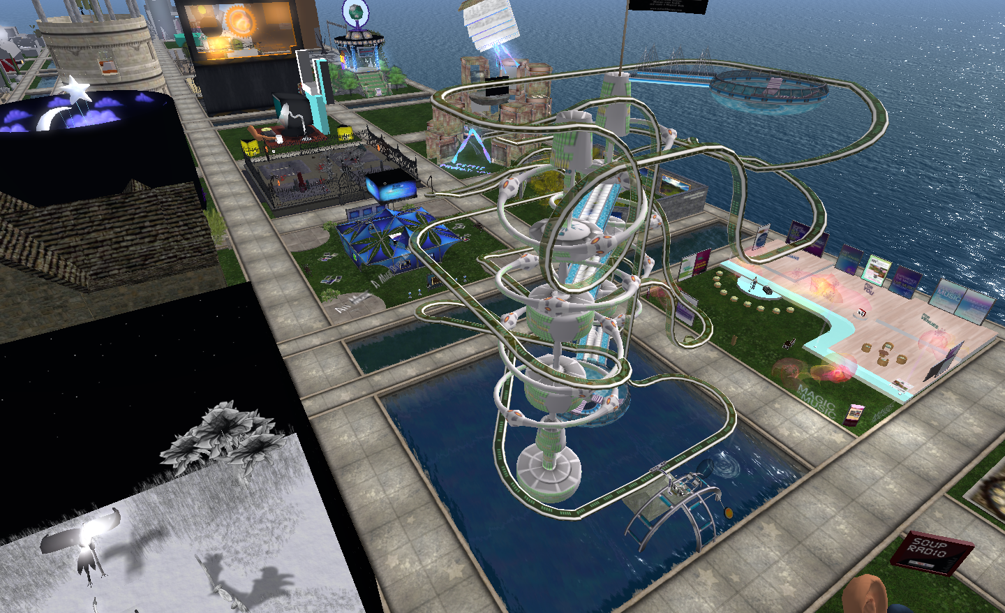 One exhibit worth a visit – assuming it withstands lag – is the NY Heath Scape roller coaster. Here you can ride (up to four at a time) around a quite hairy roller coaster (try it in ML), and learn about self healthcare. Just be careful at the end of the ride, however, I got summarily tossed from the car and ended up under water – and stuck under the walkway bordering the ride, which left me thinking, “Learn about healthcare…and drown…” – A landing zone might just be prudent here!