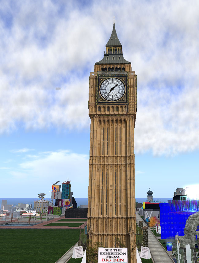 Further around the sims, I found a reminder of home: a reproduction of the Clock Tower of the Palace of Westminster, complete with a replica of Big Ben hanging inside. You can Tp up through the tower, and it is a good vantage point from which to see many of the exhibits.