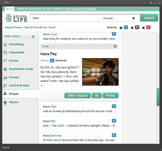 At the same time we have LL working to try to improve things, tweaking this, changing that, taking on feedback somewhere else – all of which has culminated in the arrival of the Search Viewer project and the “new” Viewer 2 Search – which people are saying actually isn’t half-bad.