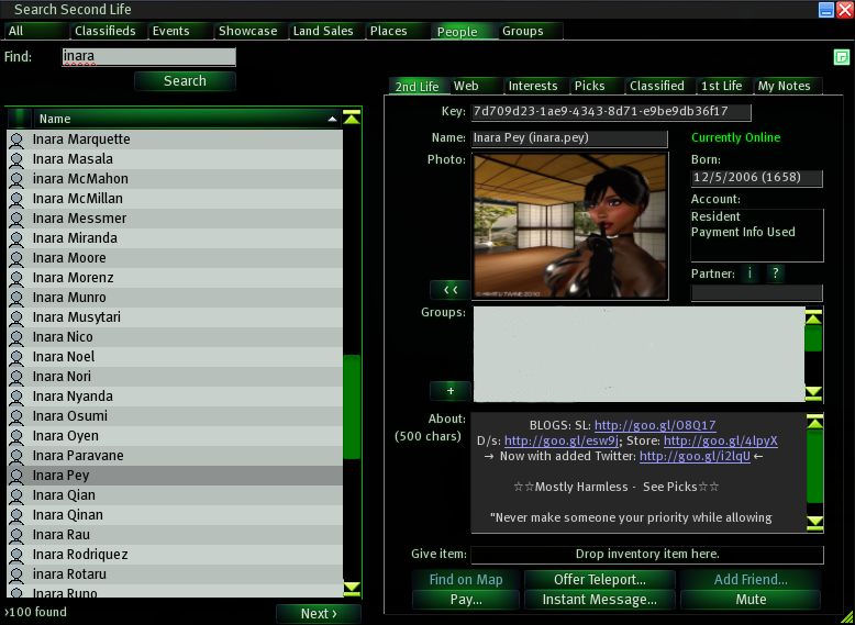 This is not 100% ideal, but it does tend to give maximum bang to the buck on any given search. When running a search on people, land, places and the like, this is massively convenient, allowing you to quickly flick back and forth between a list of results and the details on each one without taking up masses of screen space (so you can even keep an eye on what is happening around you in-world).