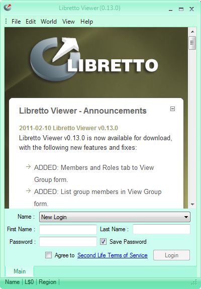 Once installed, it certainly looks somewhat like Microsoft Messenger, with the log-in screen comprising a window onto Libretto announcements and a log-in area with the obligatory check-box for accepting the SL ToS (with link for reviewing!) for people using the client for the first time.