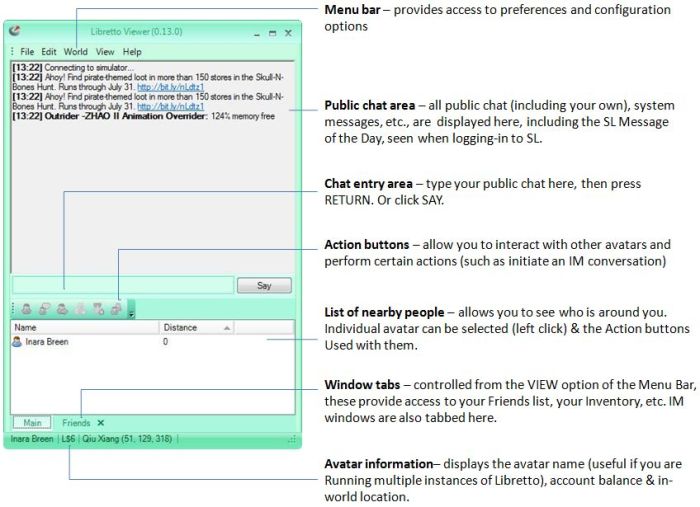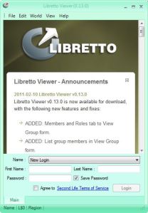 Libretto describes itself as, “A light weight, text-only viewer for Second Life. It’s designed to resemble and function as an instant messaging client, that can be used in an office environment, on low performance/bandwidth computers, or when multiple instances are needed.”