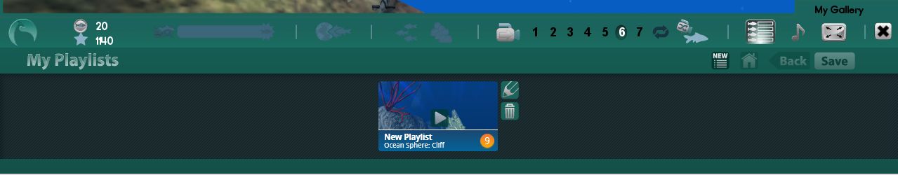 Clicking on the NEW button in the display allows you to create and name a playlist, select the ocean sphere you wish to use, and then select the fish you wish to add to the playlist. Clicking on SAVE saves the playlist, which is then displayed in the playlist area. Double-clicking on a playlist will cause it to play in the Viewer window until the window itself is clicked, and you are returned to the “main” ocean, and can resume your search for more fish.