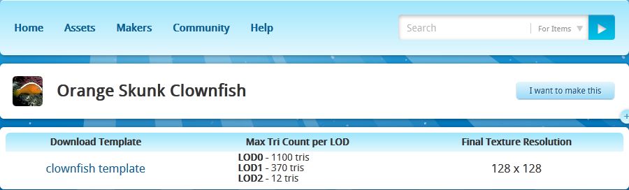 Here you can review existing assets (creations), select a species you want to create, request permission to create an entirely new species, etc. Clicking on a species brings up the template page, which allows you to download any available template you can use to create the fish in question, and provides LOD (Level of Detail) and texturing information. Templates are in Autodesk .FBX format. I’m no 3D modelling expert, so am unsure as to how well this sits with the likes of Blender and Wings3D in terms of pulling the template into the application for use, although it obviously works with high-end applications.
