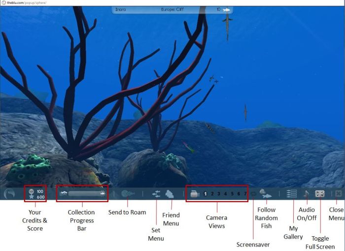 Clicking on a fish for the first time will display a floater asking you to collect the remaining fish in the “collection” to which the one you clicked belongs, and will open an additional Information Bar under the toolbar, listing the fish you need to find to collect the set. If you close this bar, the collection progress bar in the main toolbar will activate, indicating your progress in locating and clicking on fish.