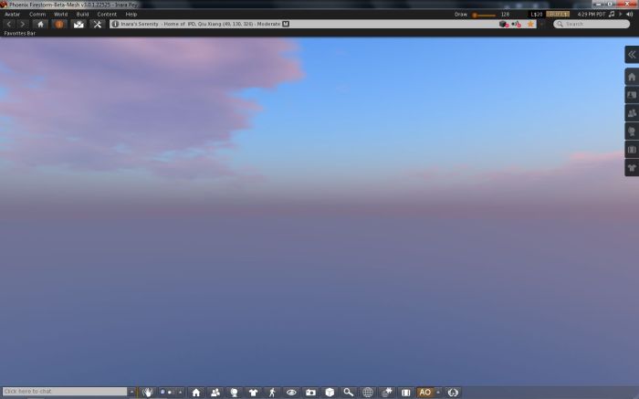 The Favourites Bar is on by default in all three, and while I like the fact that in the Phoenix and Firestorm options it is on a transparent background, this may cause issues for some and it is frequently difficult to see against, say, the sky. I also like the Hybrid option’s transparency around the tool bar at the bottom of the screen; this is a nice touch and adds to the feeling that one has a greater in-world viewing area.