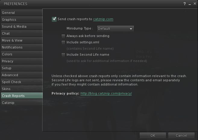 Crash reports tab: allows you to select whether or not crash reports should be sent to catznip.com, and the information the reports should contain