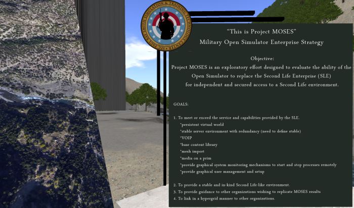 MOSES is a project aimed at evaluating the use of OpenSim as a means of providing a virtual world-based simulations and research environment available for use by relevant parties both within and without the U.S. Department of Defense. It grew directly out of the STTC’s involvement with the Second Life Enterprise product.