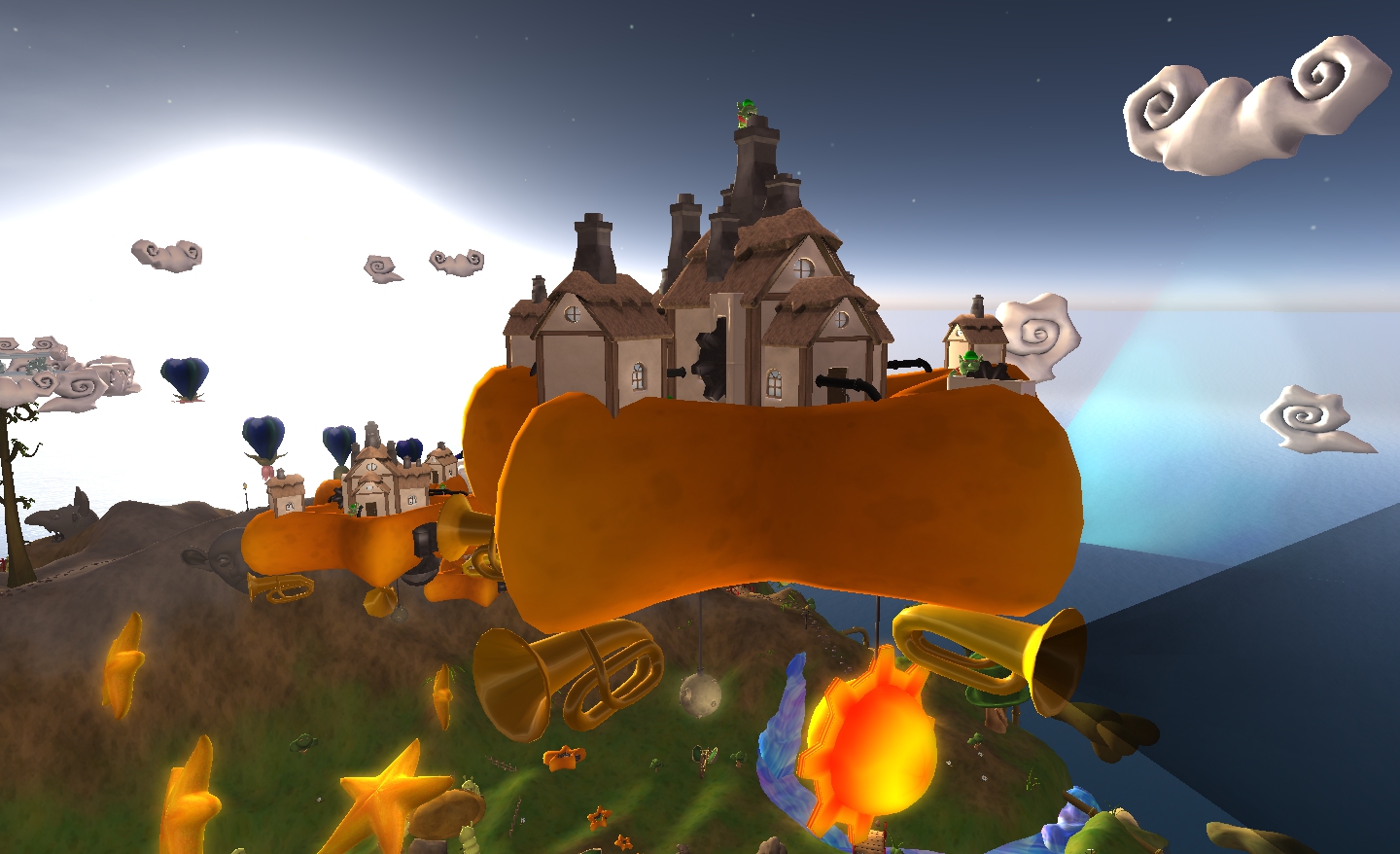 Take a good look at everything you encounter; some are static, others are enhanced by sounds and music selected, composed and recorded by Lorin Tone. Thus, the installation is very much an aural as well as visual experience. In fact, discovering which elements have sound and what it might be is very much a part of the fun when exploring Through the Lens… – especially when flying among the floating houses, of which more anon.