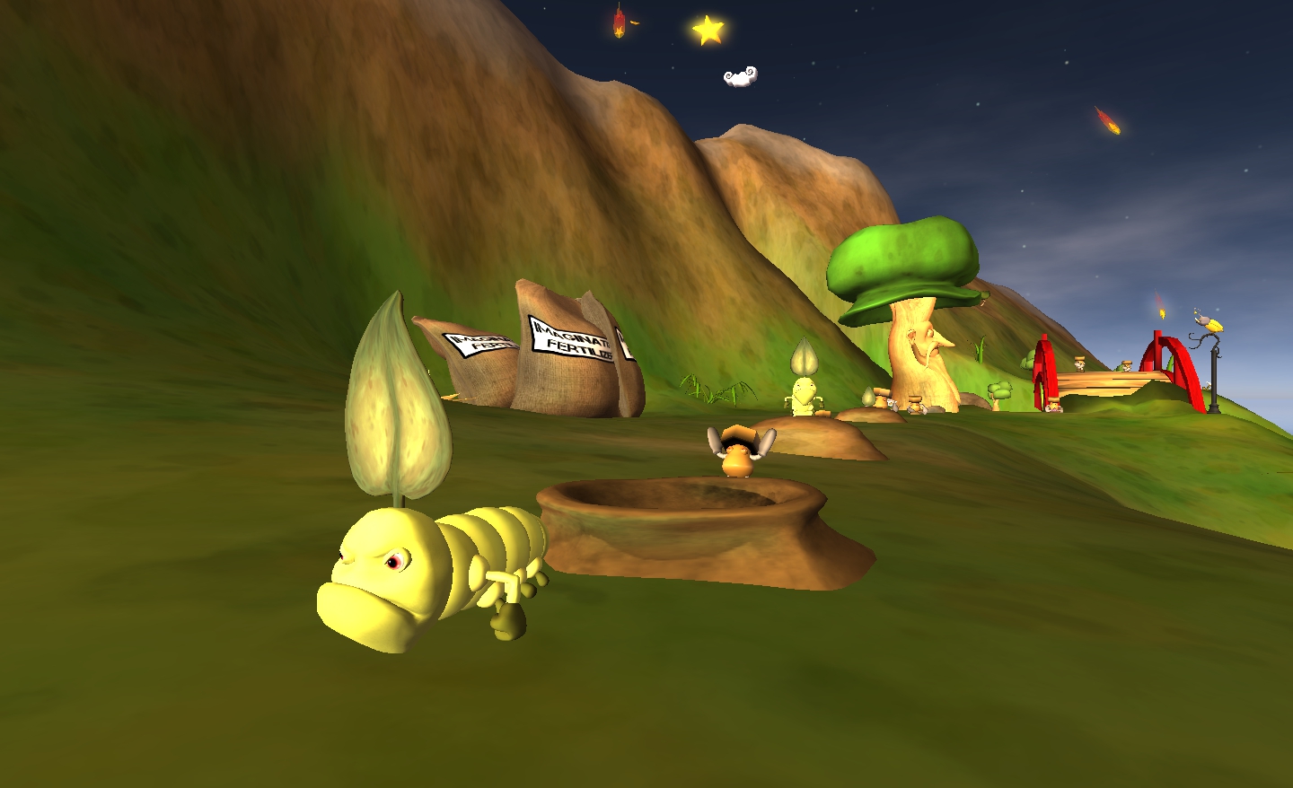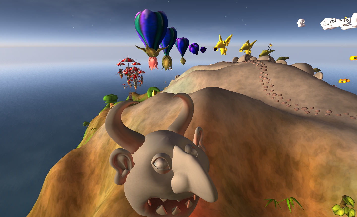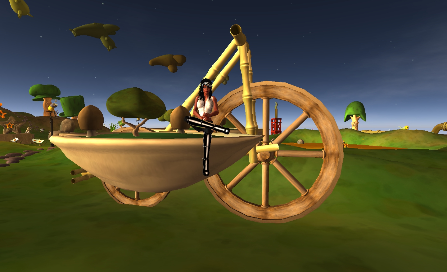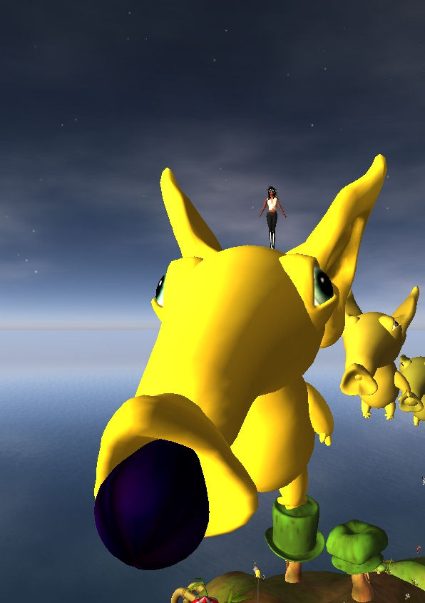 Creatures and objects of all shapes and sizes are in abundance – some, like the wooden bikes, act a little like guides, directing you to or along a route you might opt to follow as you walk the sim. Depending on the direction you do take, others appear to be marching resolutely the other way, like the little green fellow above, and his friends, whom I encountered mid-way through my journey.