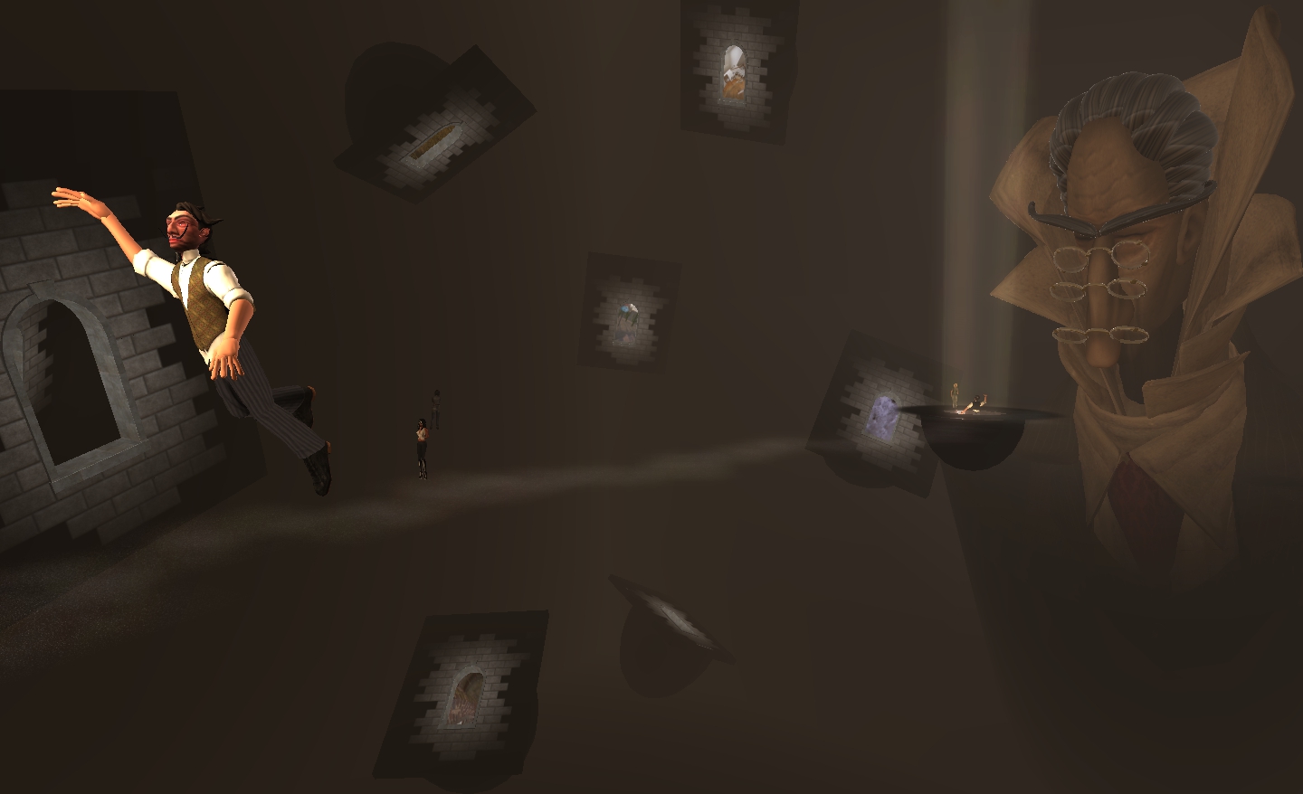 Scottius Polke returns to the theme of the laboratory with his contribution to The Path, and on a grand scale. Here you must keep an eye out for the direction you should take, negotiating giant rulers, coiled pipes and other obstacles. This actually needs some care – the route you must take climbing some of the items is very narrow, and lag here and there can easily have you stepping off into thin air if you press a key for too long – as I found out. And while you climb, be aware your every move is being watched from above, as the inventor himself gazes down upon you; but it is not his big head that will help you out of here.