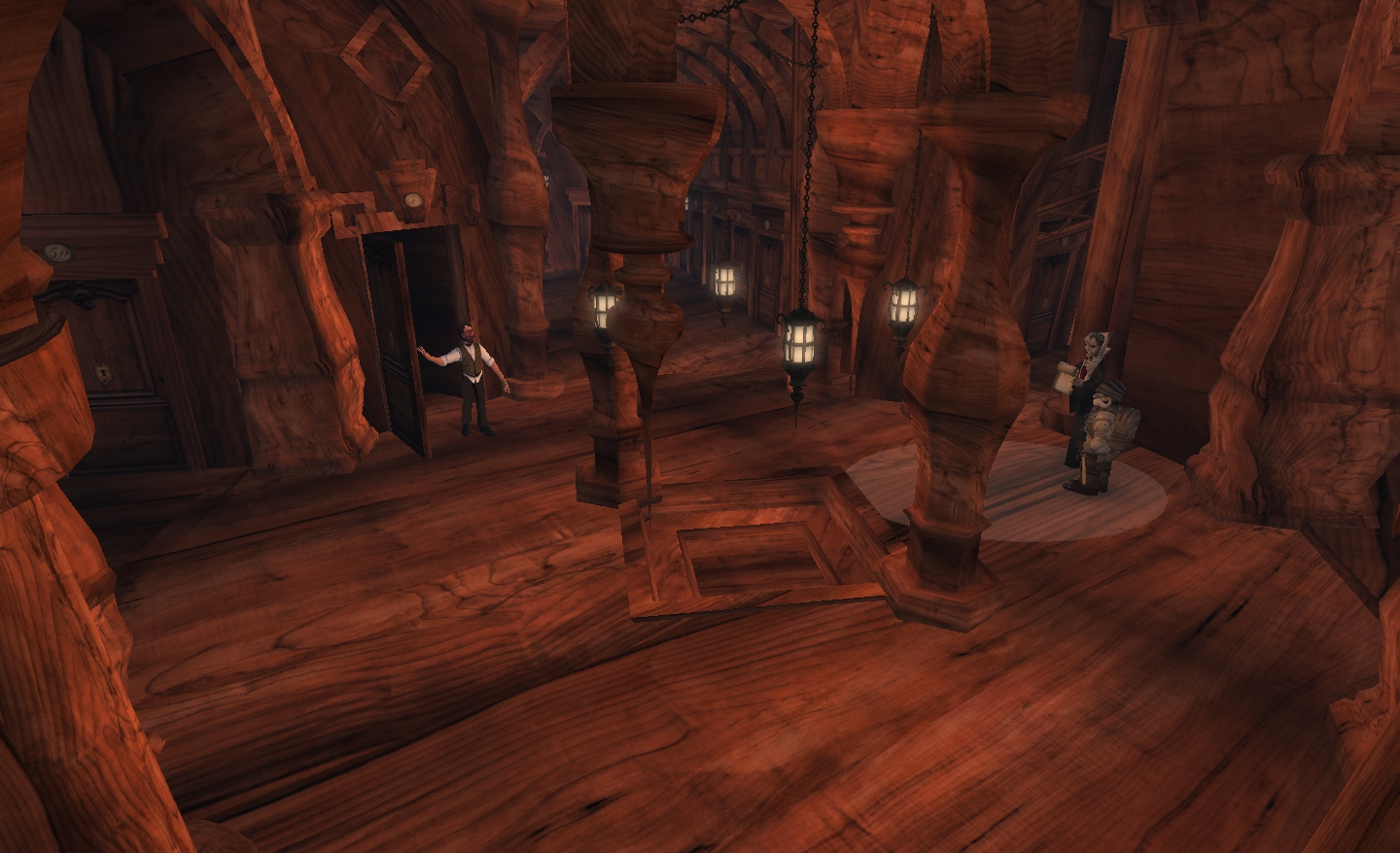 Marcus Inkpen provides the third part of the installation. Here stands the Overseer and his stout companion, conversing at the junction of several strange, door-lined hallways. Do you take one – and if so, which one? And what’s that about a key being in your pocket? Does it mean something… or…?