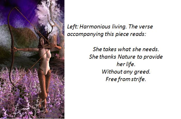 Here is the realm of those out of harmony with nature; those, we are warned, who steal and kill, who always want more. Their footprint is that of desolation where a dank mist covers the ground and nothing but fungi flourish. The air is filled with the sound of leaden, warning drums and a deathly chanting, and the path leads us inevitably to chaos and death.