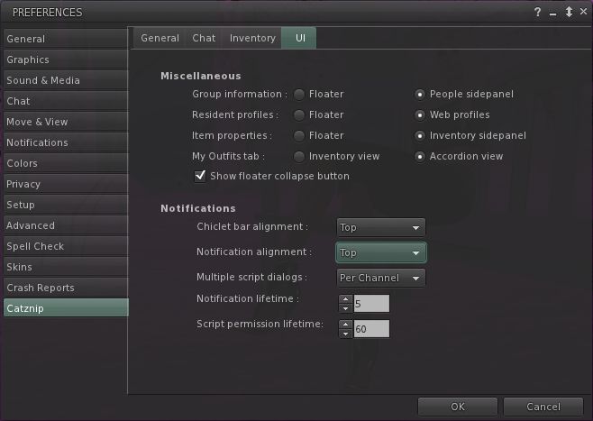 The most obvious new feature added to Catznip is that rather natty “collapse” button on the majority of panels / floaters. If you are using several panels and simply want them out of the way, but not actually closed (as you’re still using them), this button causes the selected panel / floater to collapse into a single line, allowing you to “stack” a number of panels and quickly swtch back and forth between them.Collapsed panels can be aligned to the top side of the screen (e.g. under the Navigation / Favourites Bar, if you use it), allowing you to present yourself with an alternative means of accessing those panels / floaters you routinely use.