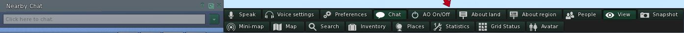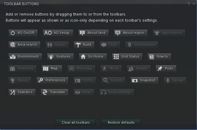 Joining the LL-supplied buttons, we have: the AO buttons and Area Search button, which I assume have been pulled across from Dolphin; About Region (shortcut to Region/Estate floater – handy for Estate Managers / Sim owners); Go Home (teleport to your home location – useful if you don’t use the Navigation Bar), Grid Status (opens the Grid status page in your designated browser); Statistics (opens the Statistics floater), and Translate (opens the Google Translate web page in your designated browser).