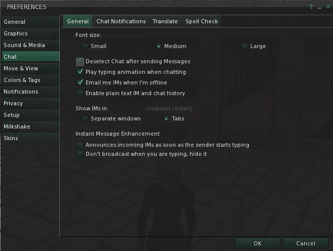 - General: include the majority of the “standard” V3 chat options, although the bubble chat option has been removed (does anyone use that?), and two “IM Enhancement” options added: the first will display “is typing” alongside their name in the IM window, the second will prevent your Viewer broadcasting the fact that you are typing to any Viewer
