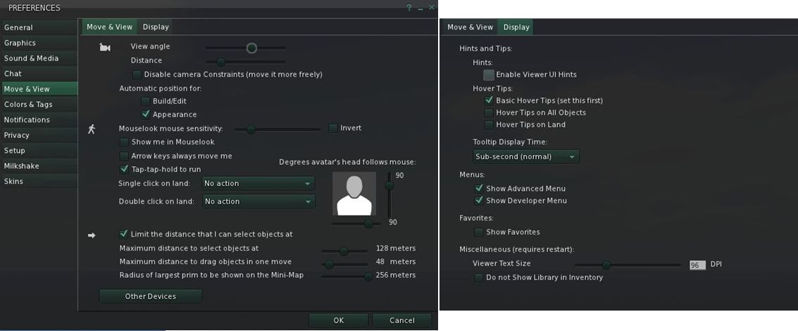 - Inventory: includes options to set what a double-click on an attachment or wearable in your inventory will do (either ADD it to anything already worn at the same point / layer or REPLACE what is already being worn at the same point / layer) and other goodies