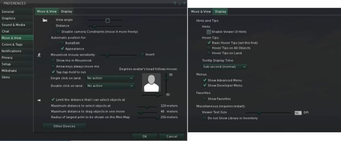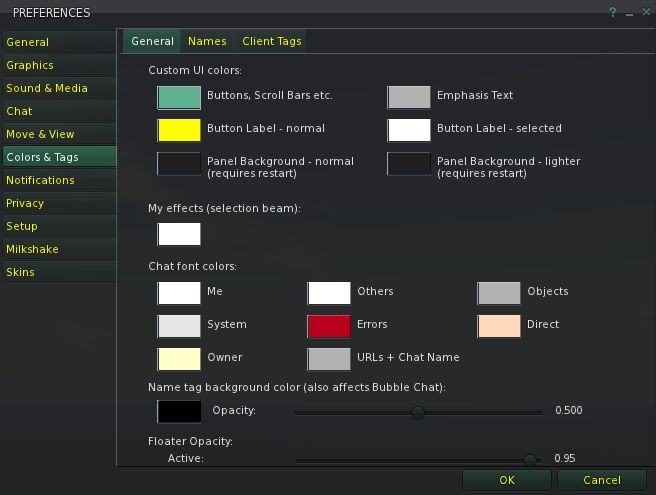 - UI: allows you to set where and how various elements are displayed (e.g. chiclet location, whether profiles are displayed as a floater or as a web profile in Viewer’s browser, etc)