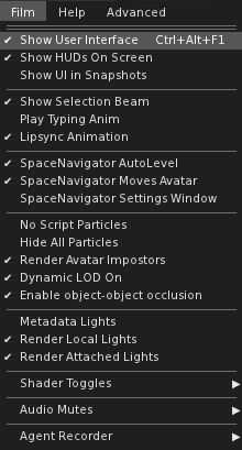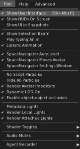 An interesting addition to the Viewer is the Film menu, which brings together a range of options that should be of assistance to machinima makers. These include avatar and graphics options, so avoiding the need to jump back and forth around Preferences. Changes made to options in this menu are reflected back in their Preferences, where appropriate.