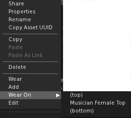 - Right-clicking on an item of clothing in Inventory that is to be worn on the same layer as another item of clothing already being worn, will display an additional WEAR ON option in the menu. This allows you to select whether the additional items is to be worn “under” or “over” the existing layer