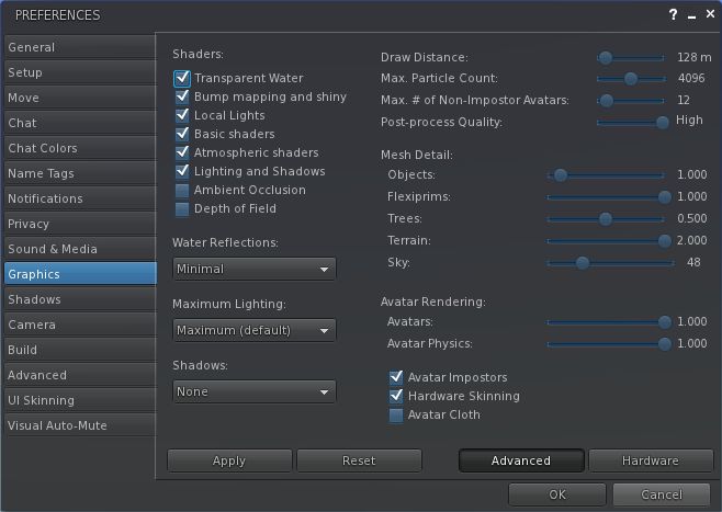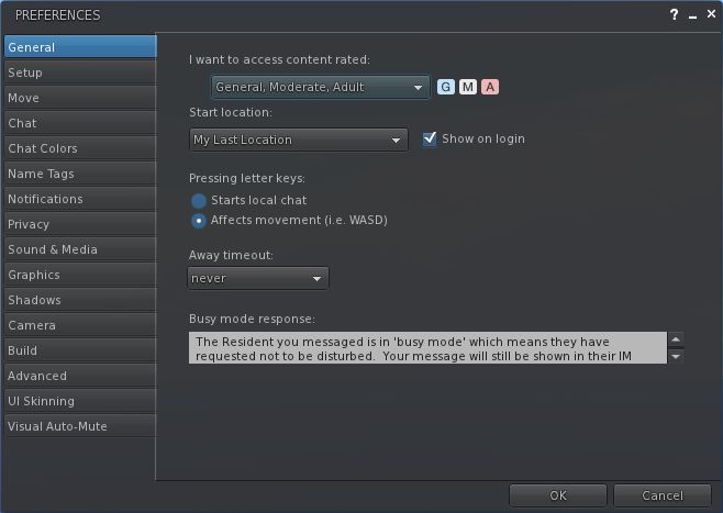 Release 3.2.8.7 sees one tab in Preferences removed (LSL Pre-processing), and five new tabs added, together with an overall re-ordering of things which may initially catch used to operating by wrote a little off-guard (Graphics, for example has gone from near the top of the tab list to fairly well down the order of things). This shouldn’t interfere with overall usability, however.