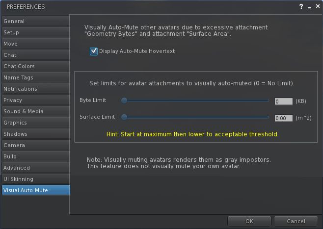 Essentially, this functionality allows you to set thresholds above which avatars with a very heavy load (high-res textures, complex attachments (multiple prims, flexi prims, sculpts, and what have you), etc., – but not scripts, which are a completely different kettle of fish) will not be rendered by your Viewer. Instead, they will appear as “grey ghosts”, similar to when you’ve muted someone; however, you will still be able to IM them and chat with them. This should theoretically reduce the load placed on the Viewer and your system in terms of rendering, and lead to an improved SL experience.