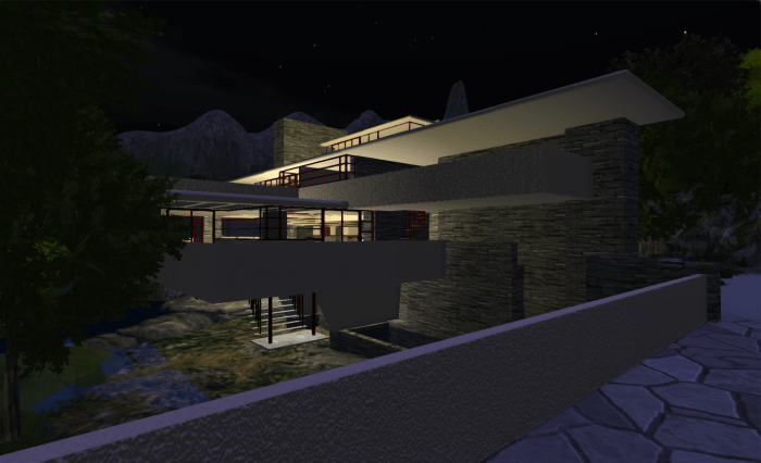 The result isn’t perfect – even with some adjustments to the build, a 1/4 sim in terms of land size is actually too small for all of it (it really does need an entire homestead size-wise. Primarily, I had to lose a parking bay in the garage (from 4 to 3) and reduce the size of the arc of the footpath linking guest wing to main house (which actually improves the build, I think). I’ve also compromised a little on the positioning: as there are others on the sim, I didn’t want them to feel disturbed as part of the build suddenly appeared over the tops of the hills dividing the parcels and thinking they had some kind of pixel voyeur on their doorstep. I also had to do with phantom sculpts to represent the “far bank” of the Bear Run, and Linden Water is representing the stretch of river directly below the first set of falls. Sadly, compromises left me with no room for the rest…