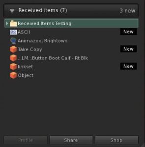 Those familiar with Direct Delivery testing will already be somewhat familiar with Received Items – it is a section of the Inventory floater wherein anything purchased from the Marketplace will show up. However, the overall functionality has now been extended so that anything you obtain or receive by way of a “new” inventory item will pop-up within it.