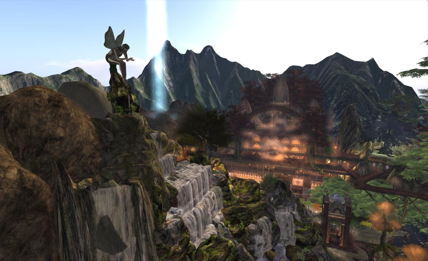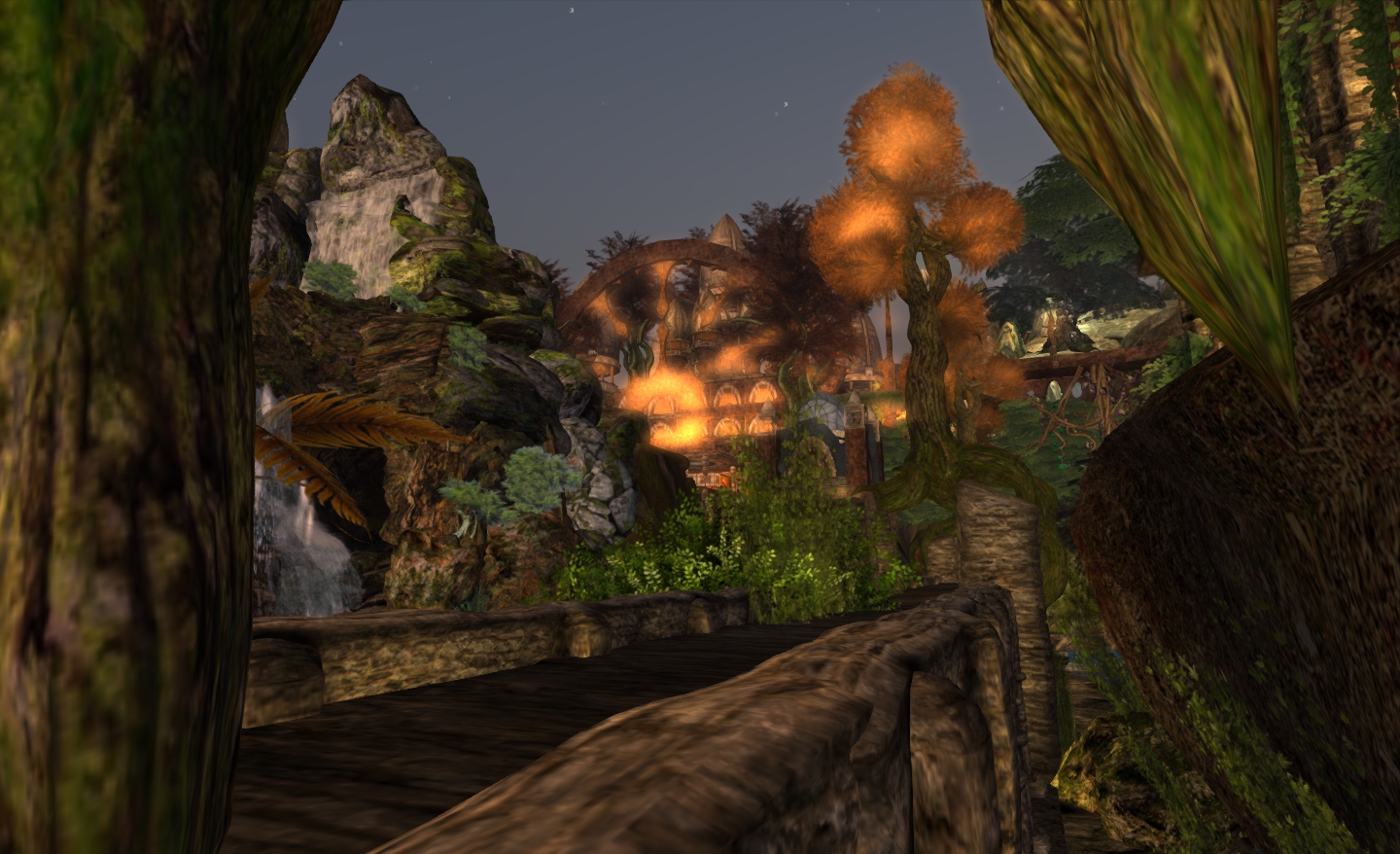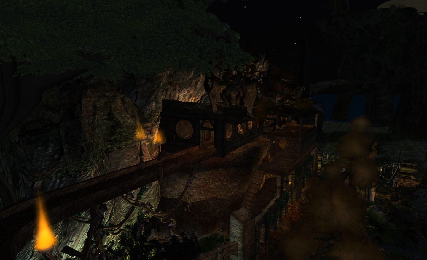 Wander the upper levels of the castle and you will come to stone walkway supported by great trees, lit by lanterns, leading you on to other wonders and places such as a market high in the trees, views out over waterfalls which have their own secrets to explore. Walk on through the market and the evolving landscape of Crimarizon 2, the sister sim currently under construction, beckons – but you’ll have to wait to explore it.