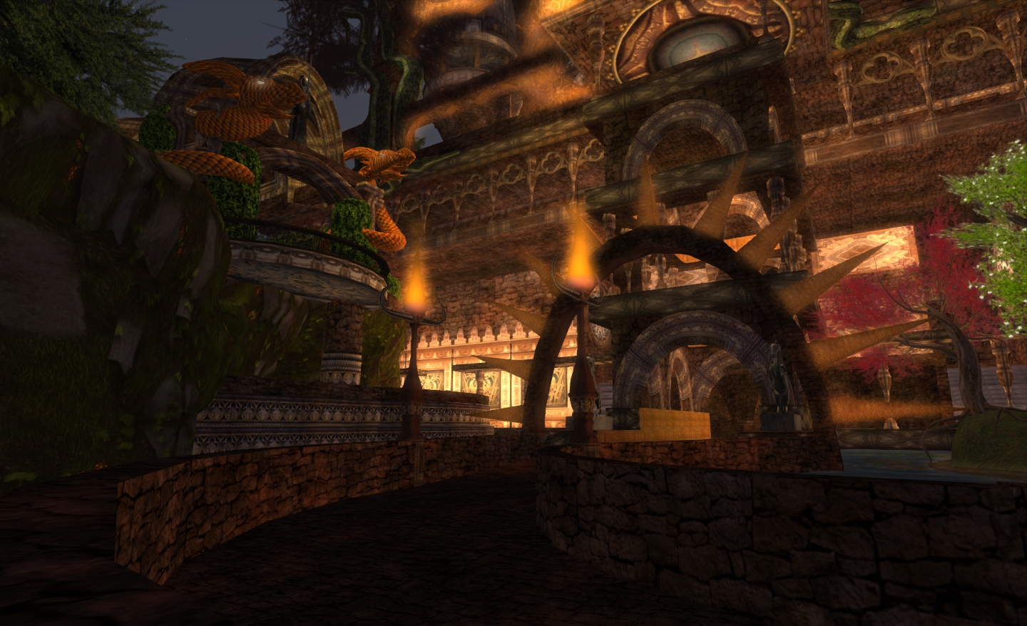 I used search to teleport to Crimarizon, and did find the coordinates slightly off – I arrived on the wrong side of the land area, ankle-deep in water. In case this is an error with the build, rather than a SL glitch, you might want to use this SLurl. The arrival area itself is a stone walkway over the water, situated in a lush landscape, lit by ornate lanterns; before you stands a magnificent tower / archway.
