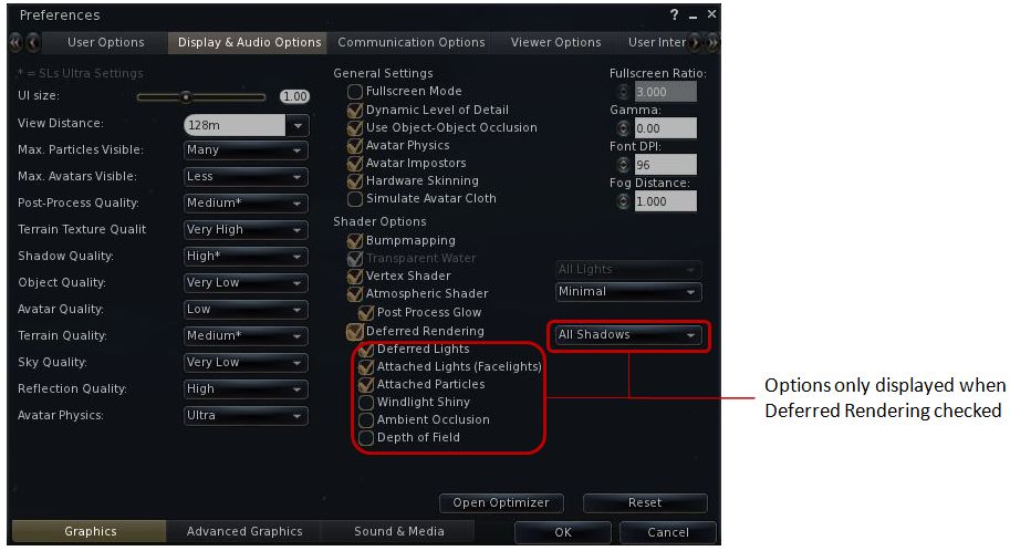 - Graphics: displays a re-ordered and improved graphics settings option list as shown below, with advanced options for deferred rendering only displayed when the deferred rendering option is checked. This tab also includes a button for accessing Niran’s own Optimiser floater