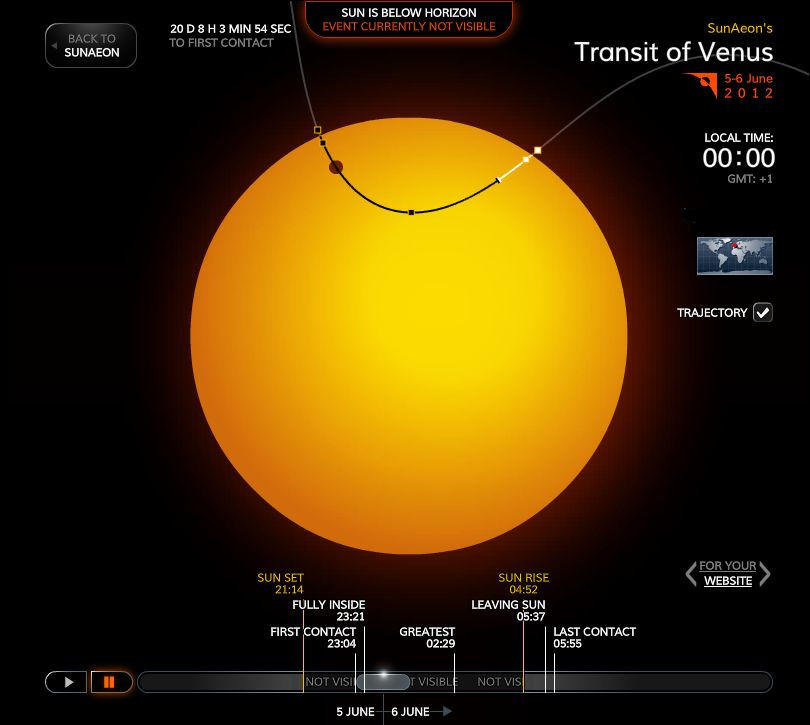 SunAeon has added a new model to their website: Transit of Venus. As the name suggests, it tracks the forthcoming transit of Venus across the disk of the sun which will occur on the 5th / 6th June 2012, and allows you to experience the transit, even if it is not visible from your location at the time the event occurs.
