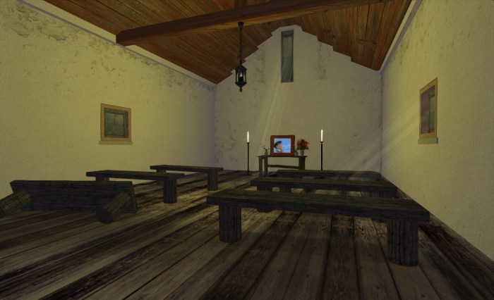 The chapel is a short walk further on, and is the latest addition to the island. “One of my tenants lost his RL son,” Skate explains as we reach it. “I thought we should have a place on the island, to go, if we need to.” The chapel is tasteful in its design – whitewashed walls, sun-faded timber roof, with a simple but effective memorial inside.