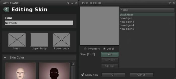 - Local Textures works both with applying textures to prims and to applying skins and clothes to avatars – so clothing / skin designers can test their work using the official Viewer in the same way as they can using Temporary Textures on popular TPVs