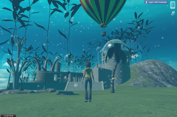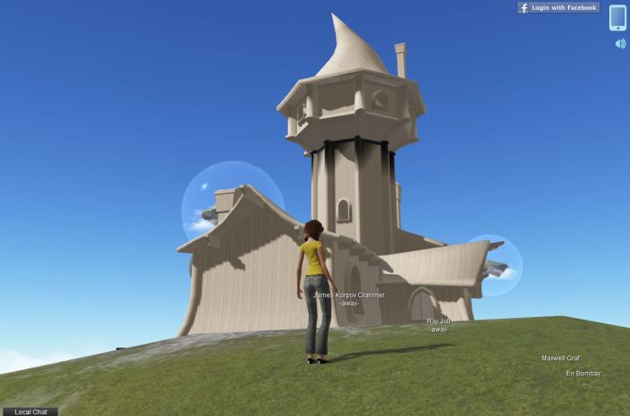 The island-in-the-sky concept is interesting. Those logging-in to Cloud Party via FB have the option of claiming space for a home – there is apparently at least one style available from the library – and some customisation is possible. Land is currently “free” to FB users, but this is set to change in the future, as the company will be using the land model for its revenue stream, and islands will be offered for rent.