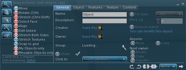 As for the casual users, instead of trying to make the Tools floater fit every usage, I was thinking of another floater with just 5 tabs: Move, Rotate, Resize, Colors/Textures and Contents.