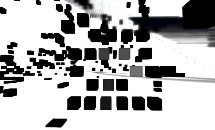 This is a musical construct comprising boxes, elements and levels, which may at first glance appear completely random – but there is order. Each box is a sound – a note or chord – which is played when touched. Some will play once when touched, others work on a toggle – they will play until touched again.