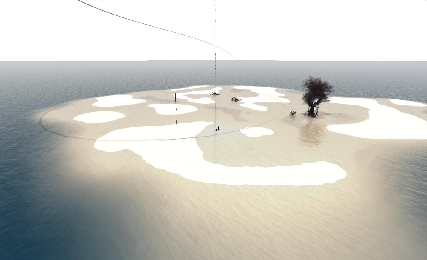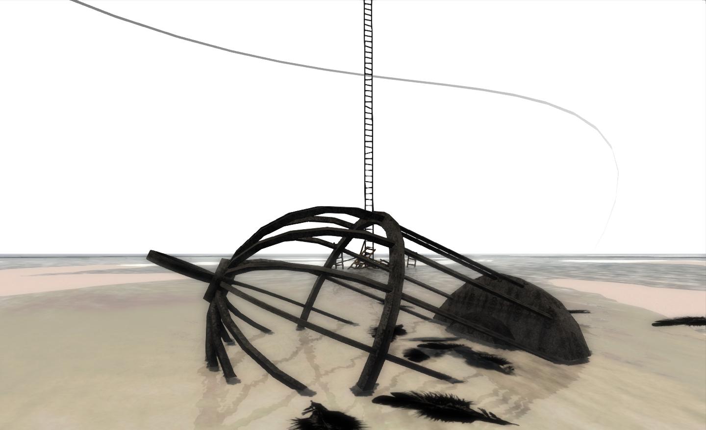 Chouchou region at ground level is a minimalist build – just a series of sand bars in the water, interspersed with a few seemingly random items: a piano sitting under a lone tree, a cage of some description and a ladder leading upwards to the sky. Feel free to wander and listen to the music; Juliet Herberle has a wonderful voice when singing in both English and Japanese, and it forms a melodic accompaniment to your wanderings – which will no doubt lead you to the strange, heaven-pointing ladder.