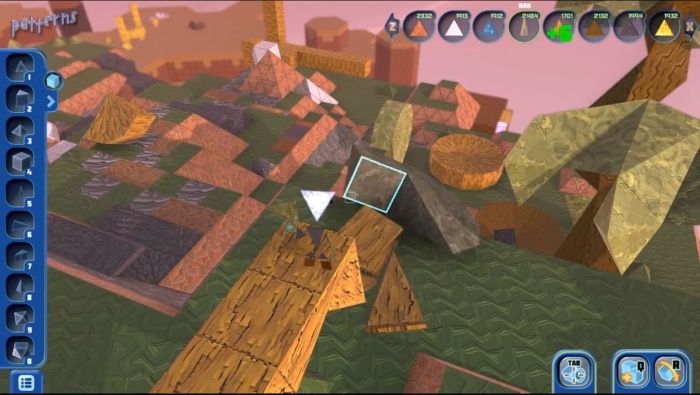 The core aspect of the game is that of “shared creativity”; people working individually or collectively, developing their own work, sharing it with the world at large so that others can enhance or modify creations and everyone learn from one another. Two additional aspects of the gameplay in Patterns are an element of discovery and the use of a physics engine from the ground-up.