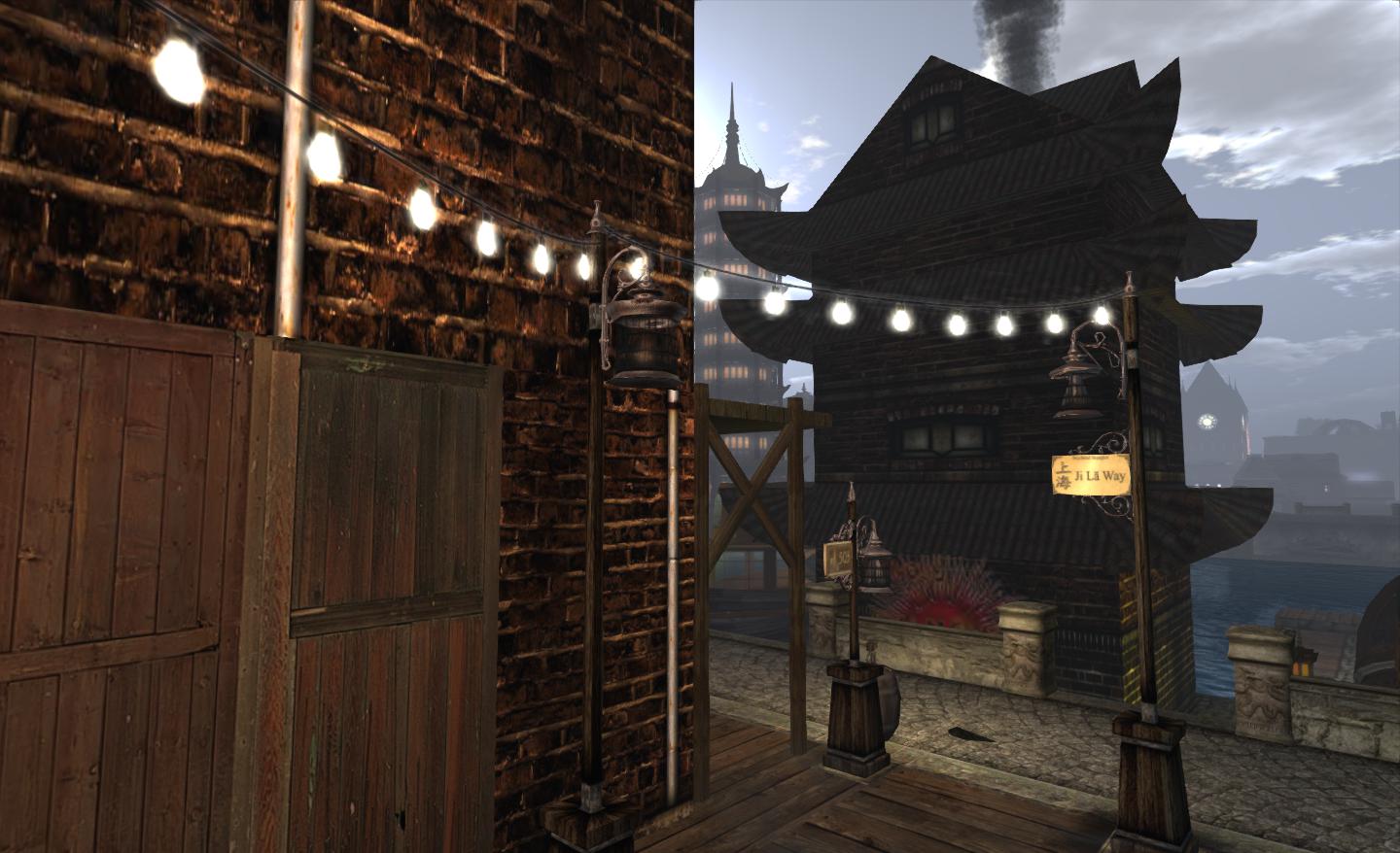 Steelhead itself is the commercial centre for the community. here you’ll find the train station, stores and wide streets and the town hall, wherein a weekly meeting of residents is held to discuss community matters. To the west of this is Steelhead Shanghai, a fascinating “Sino-steampunk” region which brought to mind photos I’ve seen of the Hong Kong harbour front circa the 1920s (although Hong Kong admittedly never had dirigible junks sitting on the waterfront).
