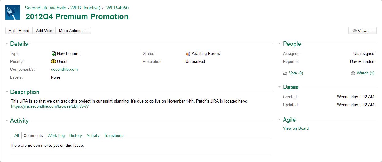 This is probably listed as a public issue in error, so I fully expect it to vanish behind the curtain next week. However, it raises interesting questions. Why a JIRA for a promotional offer, and why a link to a Linden Department of Public Works JIRA (LDPW-77, closed to public access)?