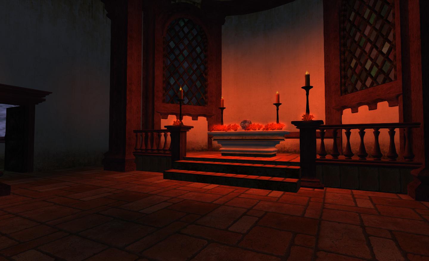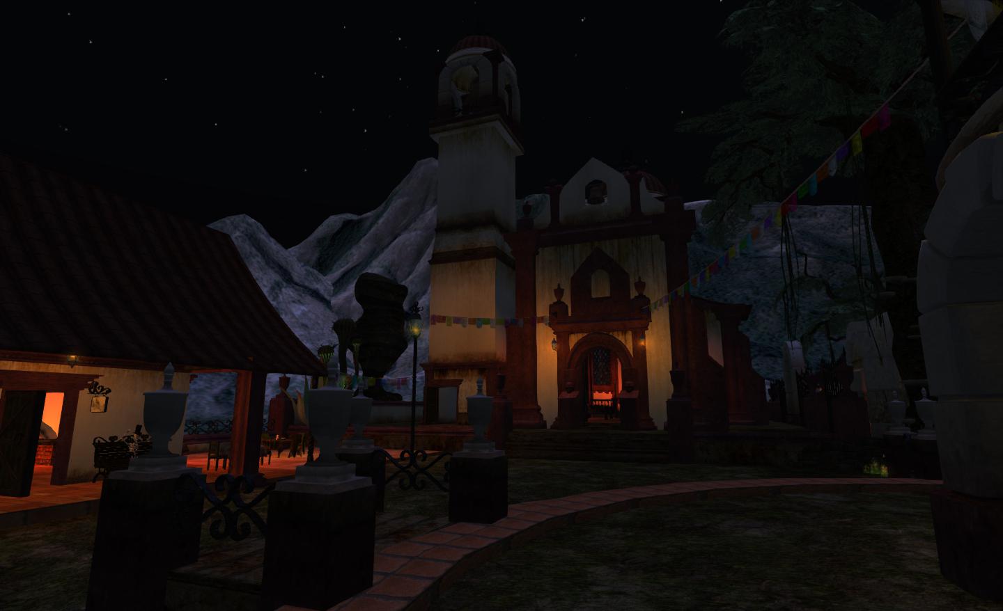 You arrive on a small gazabo-like platform just outside of a churchyard, beyond which lies a small village. Here you’ll find background on the exhibit and the Day of the Dead celebrations, as well as information about José Guadalupe Posada, whose work features in the exhibit, and about the Calavera Hunt. It is also here that you should set your viewer to Midnight in order to fully enjoy the installation as intended. I opted to use the windlight “A-12 AM” preset, as I love the vibrancy it gives to colours – and Day of the Dead is a colourful festival.