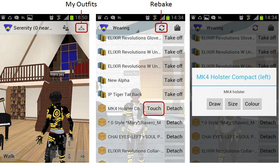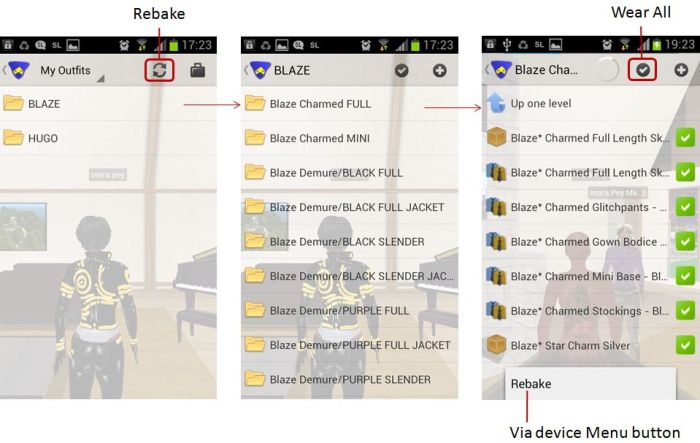 - You may have to rebake to update your avatar’s appearance – click the Menu button of your device from within the outfit folder to display a Rebake option and tap that, or click on the icon at the top of your outfit folders lists.