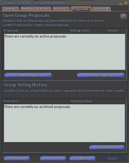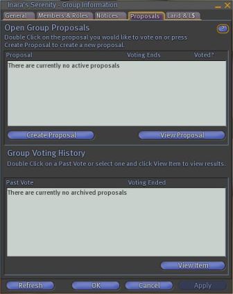 Those who have been in Second Life a long time (i.e. prior to 2007) may remember the old Proposal tab within the Viewer 1.x Group information floater (see right).